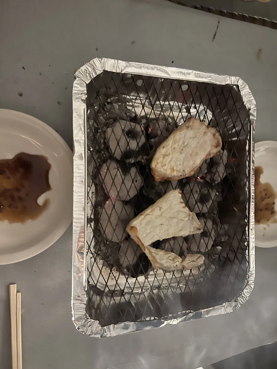 そして、しばーらく、着火剤臭。このまま焼いた肉食べたらアカンよね、としばし待ち。