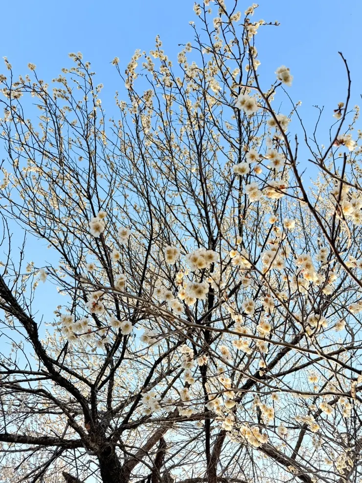 暖かな春の陽射しを浴びながら、梅の花が見ごろを迎えた美しい風景を楽しんでください