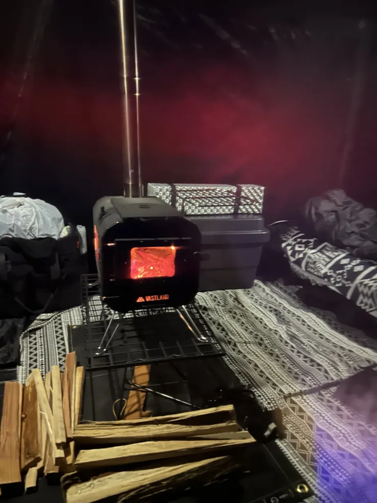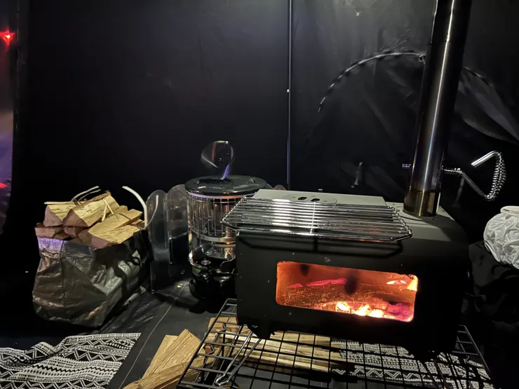 前回のキャンプはシルナイロンのシェルタードームテントで薪スト+灯油ストーブのダブル運用しましたが今回TCって事とサイズ感がコンパクトな事もあり薪ストだけで幕内30℃超え
