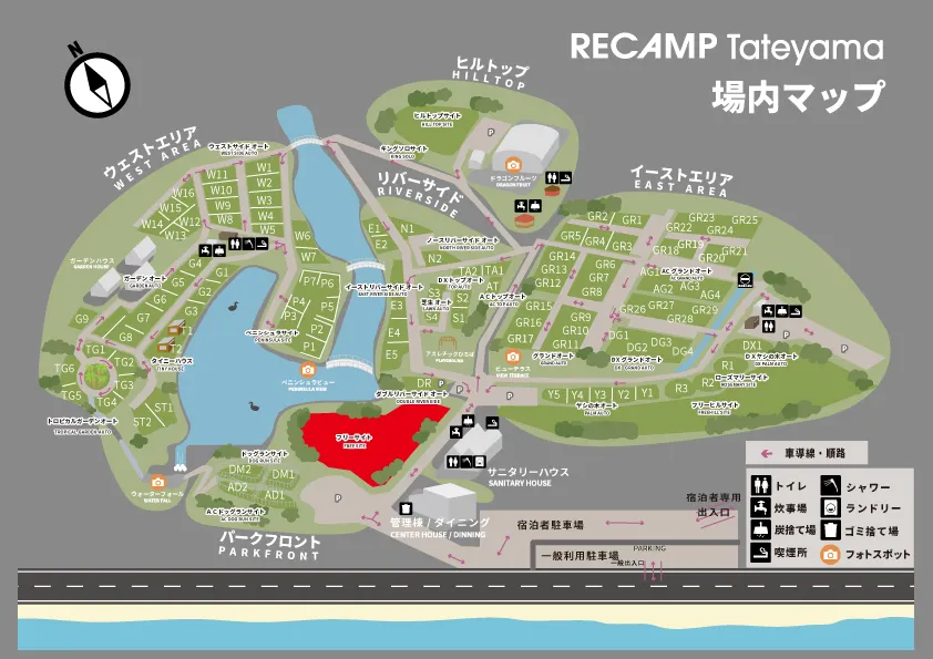 フロントや売店、カフェの併設された管理棟や、シャワー、トイレ、炊事場等の水回りが集約されたサニタリー棟もすぐ近くでとっても便利な立地です!