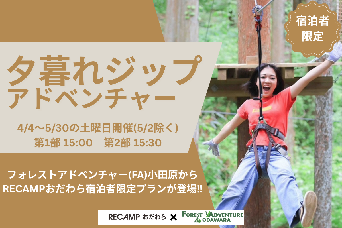 【RECAMPおだわら宿泊者限定】テント設営後にひとっ飛び!「夕暮れジップアドベンチャー」開催