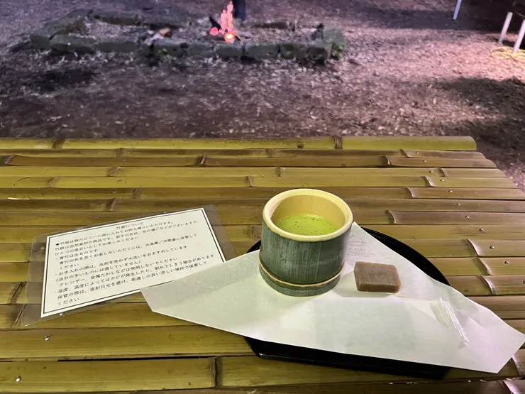 これを持って竹林の中の茶屋に行くと500円で抹茶と栗の和菓子のセットをいただけます