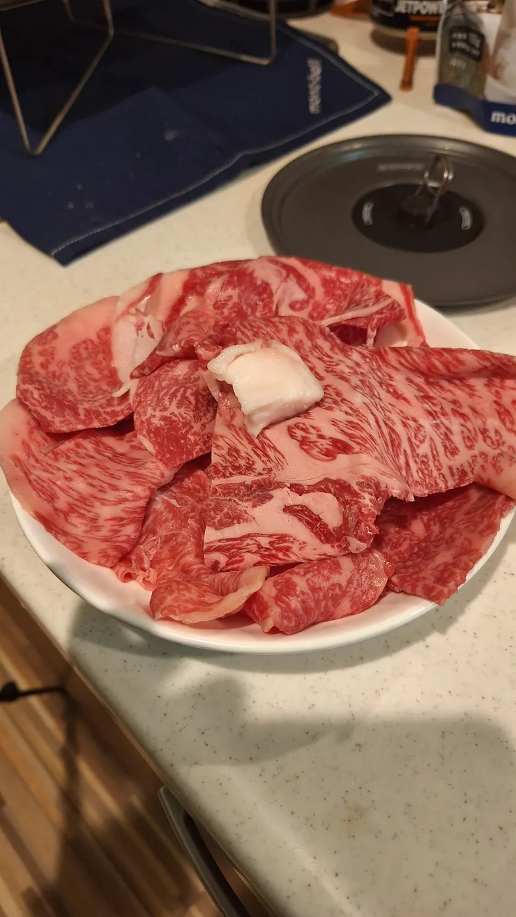 駅前の、大丸さんの地下のお肉屋さんで、黒豚のしゃぶしゃぶ肉と、100g=1,000円のすき焼き肉を買い、今回のテーマはキャンプ鍋です。
