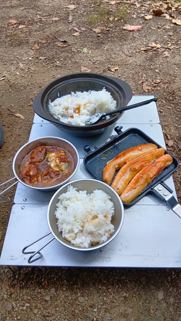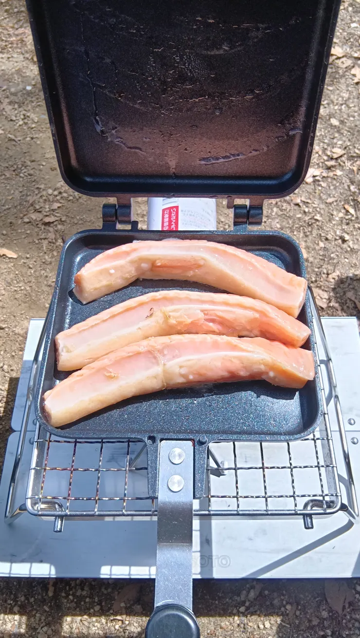 さば味噌をシェラカップに移して、空いた炭火の上で温め、鮭ハラスはHSMで焼きました。