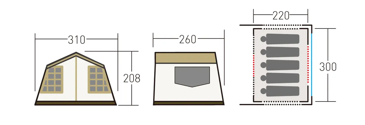 ドーム型テントと一線を画すのが、その広々とした室内空間です。壁が垂直に立ち上がっているため、テント内での圧迫感がなく、大人が楽に立ち上がって着替えや荷物の整理ができます。