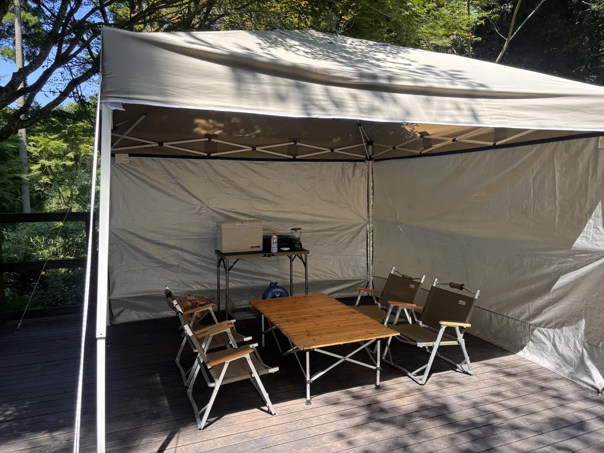3m×3mの大型タープ下には、「あったらいいな」を、あらかじめ揃えました♪