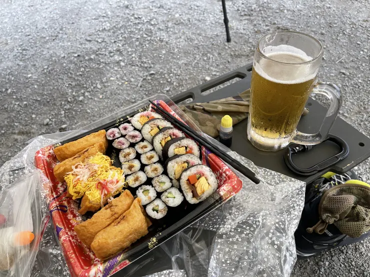 このキャンプ場さん何と言っても生ビールがジョッキで飲めることで有名。なので受付終わりに一杯。オーナーさんと喋りながら一杯。設営終わったら一杯。六助寿司食べながら一杯飲んでました。