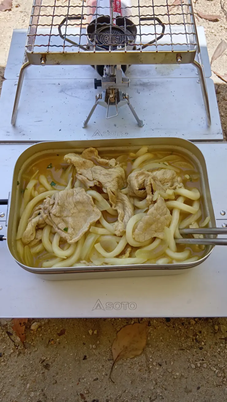 うどんを茹でてザルにあげ、スライスした玉ねぎと豚肉を茹でたところに粉末スープを投入。