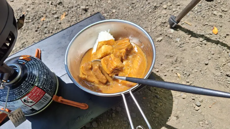 ニシキヤキッチンの傑作『和風豚角煮カレー』。mont-bellのアルファ米でいただきます。キャンプ通して、すべての火器をジェットボイルで過ごしました。(写真④)