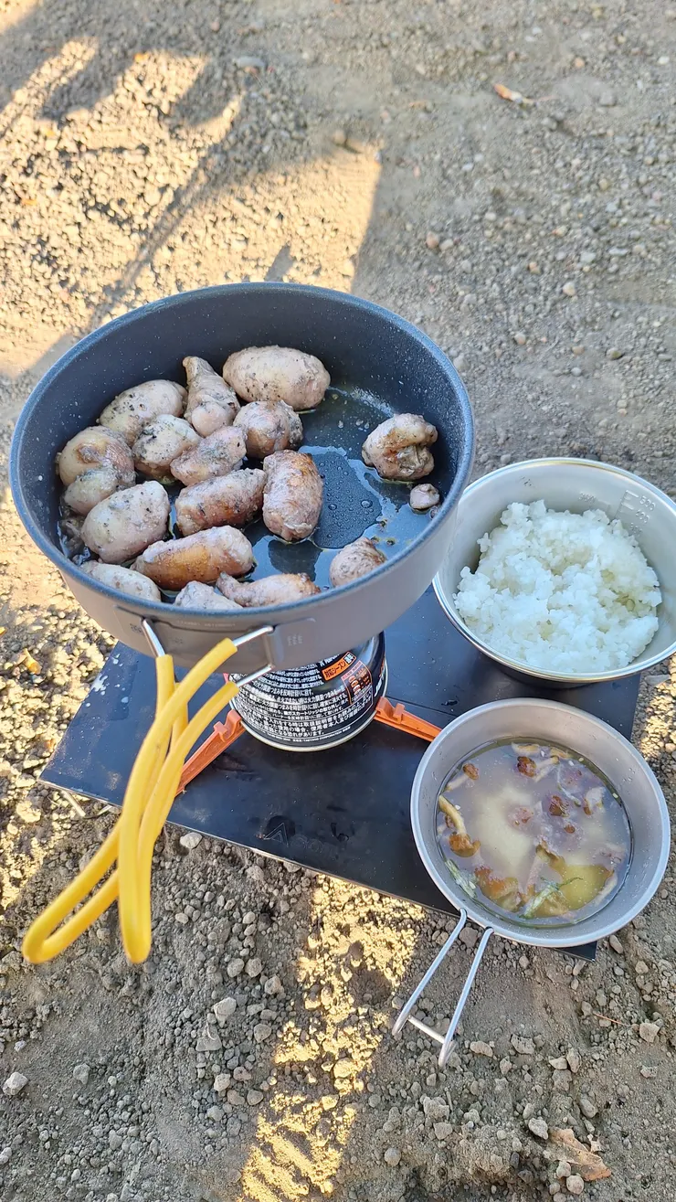 日中、気温が上がってくると、風が強くなるそうで、タープの崩壊も心配してましたが、なんとか二泊堪え忍びました。(写真②)