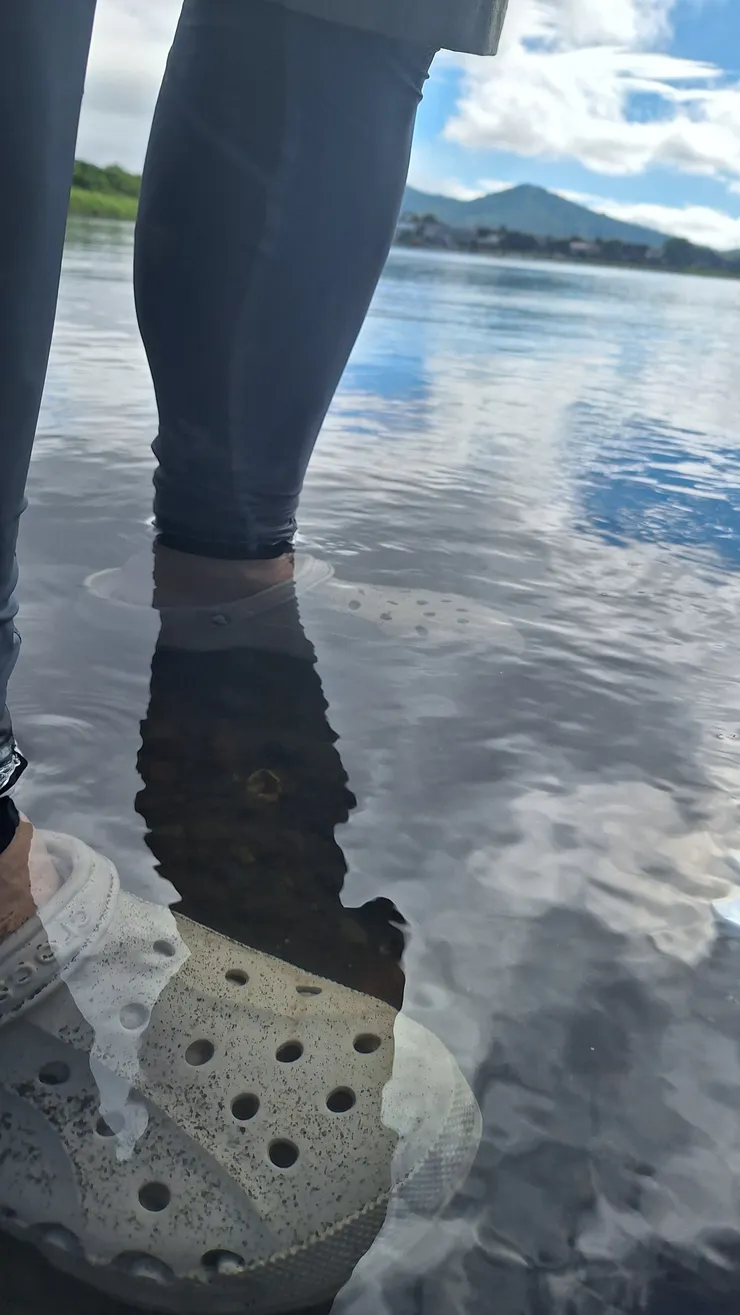 前回の本栖湖で最高だった入水の儀も最終日に決行。すぐ、そこにボートが停まっているので、おそらく、急に深くなるタイプだと思われますので、実際にやる方はご注意ください。2泊、はき続けた靴下を脱ぎ捨て、いざ、湖へ。最高に気持ちよかった。(写真⑤)