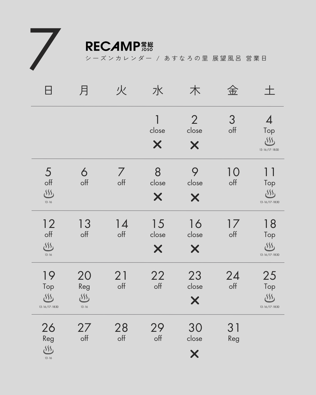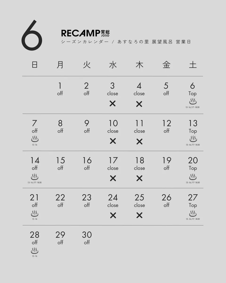 トップ > 公認アカウントの投稿 > その他 > RE... 茨城 | RECAMP常総(水海道あすなろの里内) 公認 2025/04/01 14:30 RECAMP常総 シーズンカレンダー / あすなろ展望風呂営業日 現在ご予約可能なお日にちのカレンダーとなります。※「水海道あすなろの里」とは営業日が異なりますので、ご注意ください。公開されている以降のカレンダーは順次更新してまいります。 テントサイトプラン一覧・料金表 ⇒ こちらロッジ/常設プラン一覧・料金表 ⇒ こちら 茨城 | RECAMP常総(水海道あすなろの里内) いいね 共有する 共有する X facebook LINE リンクをコピー 茨城 | RECAMP常総(水海道あすなろの里内) 都心から60分の超好アクセス&ファミリー向けキャンプ場。平日・日曜などはお得なソロデュオ向け料金も◎ 関東 > 茨城県 > 常総・結城・桜川 公園 / 林間 グランピング / 区画サイト / ロッジ・ログハウス・コテージ その他 / 土 / 芝 通年営業 団体・貸切OK / 携帯電話OK / ペットOK / 花火OK / 手ぶらキャンプ・レンタル リキャンプジョウソウ(ミツカイドウアスナロノサトナイ) 詳細を見る コメントする 0 件の返信 (新着順)