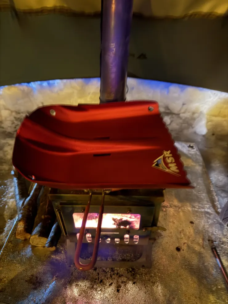 投稿を表示ピン張りされたポモリーのテントに年季の入ったチタン製の薪ストーブ。