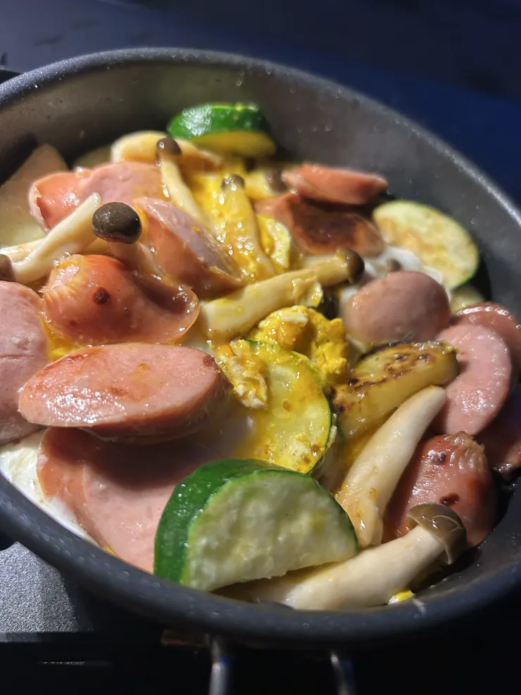 つまみはフランクフルト、シメジ、ズッキーニのガーリックバター炒め、塩とペッパー多めにして最後に玉子を絡めました。