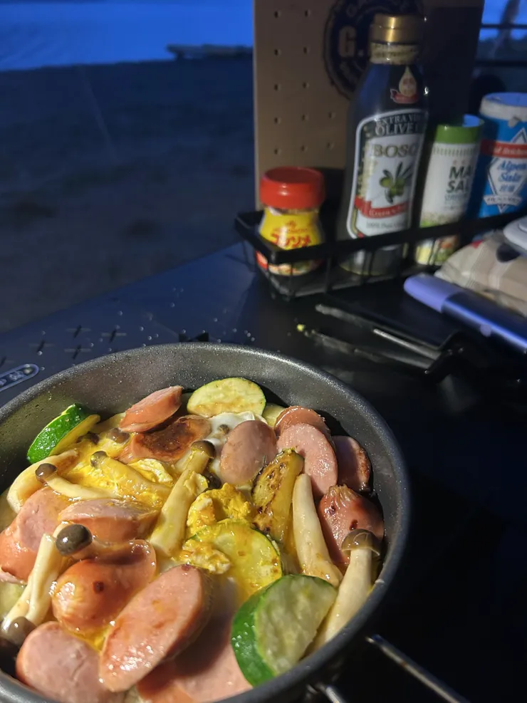 つまみはフランクフルト、シメジ、ズッキーニのガーリックバター炒め、塩とペッパー多めにして最後に玉子を絡めました。