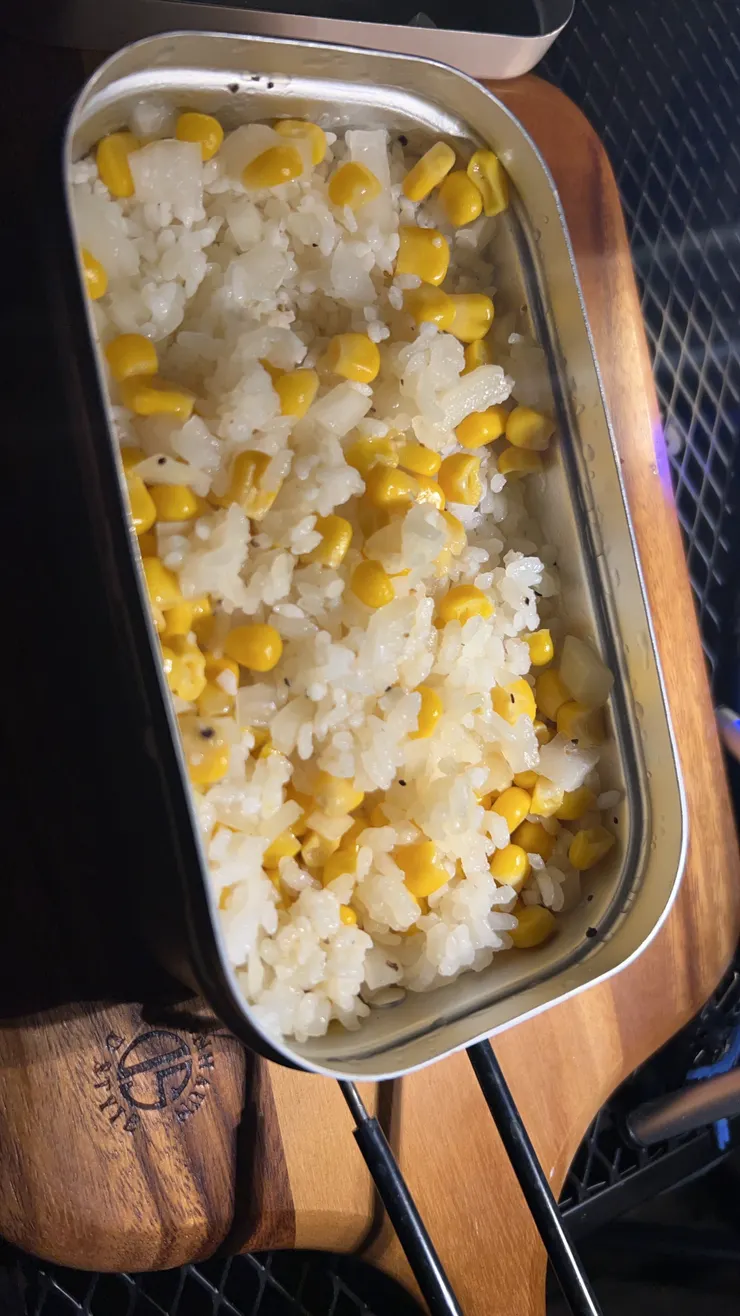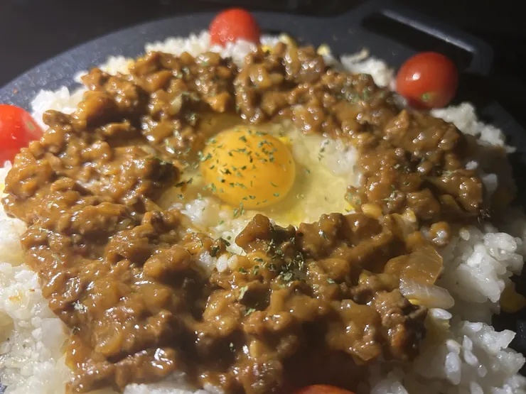 メインはコーンと玉ねぎみじん切りを入れたバターライスを炊いて牛肉を叩いて超粗挽き仕様のドライカレーを作りました。
