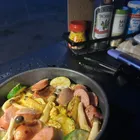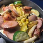 つまみはフランクフルト、シメジ、ズッキーニのガーリックバター炒め、塩とペッパー多めにして最後に玉子を絡めました。