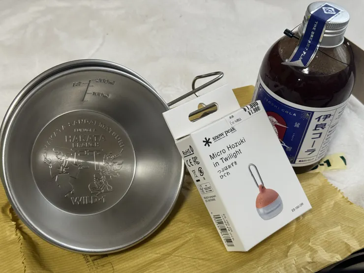 購入で増えたのは初めて行ったWILD-1の店舗限定シェラカップ、スノーピークのつぶほおずき、伊良コーラの原液、筑紫野のクロスオレンジさんでセール品のバラスティクスのボウル、蓄光のスティックです。