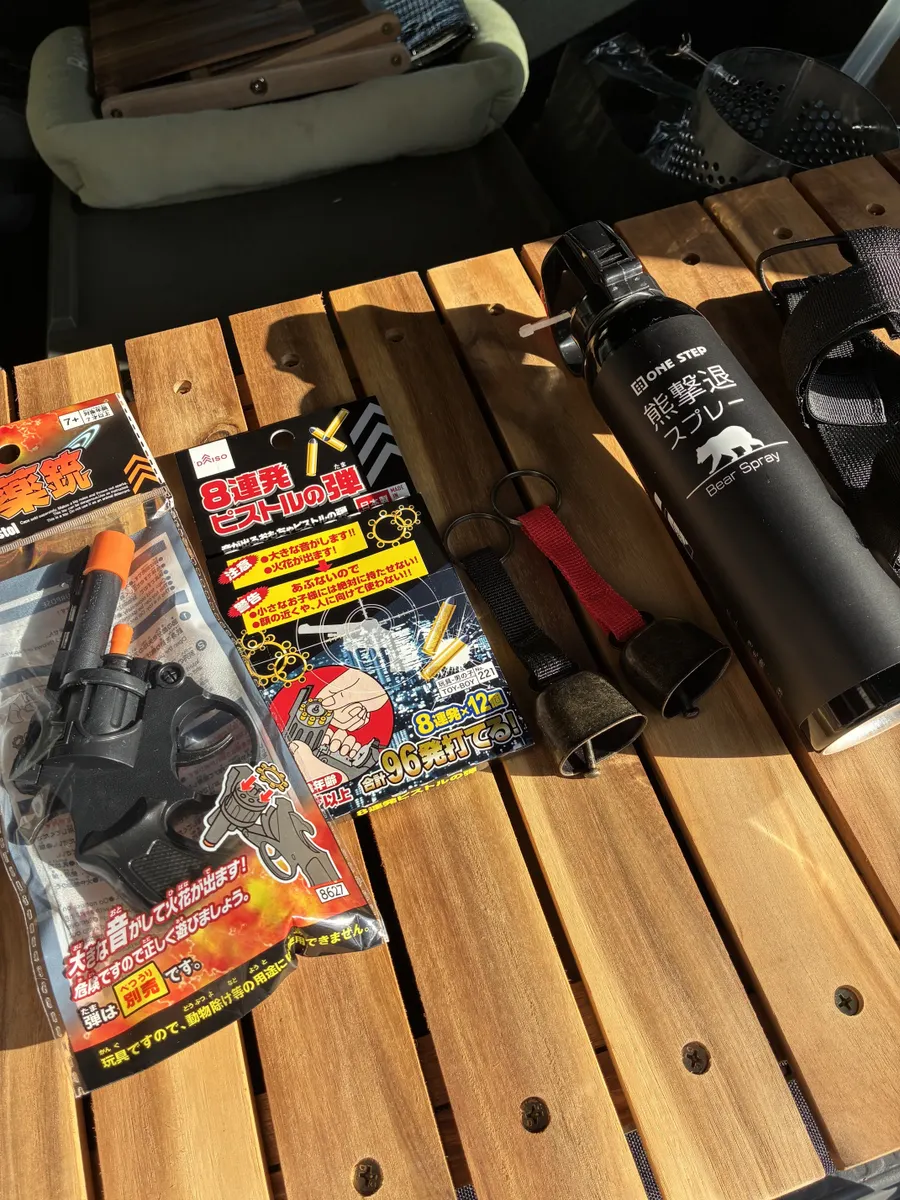100均で鈴、音追い火薬銃と弾、Amazonで熊スプレー