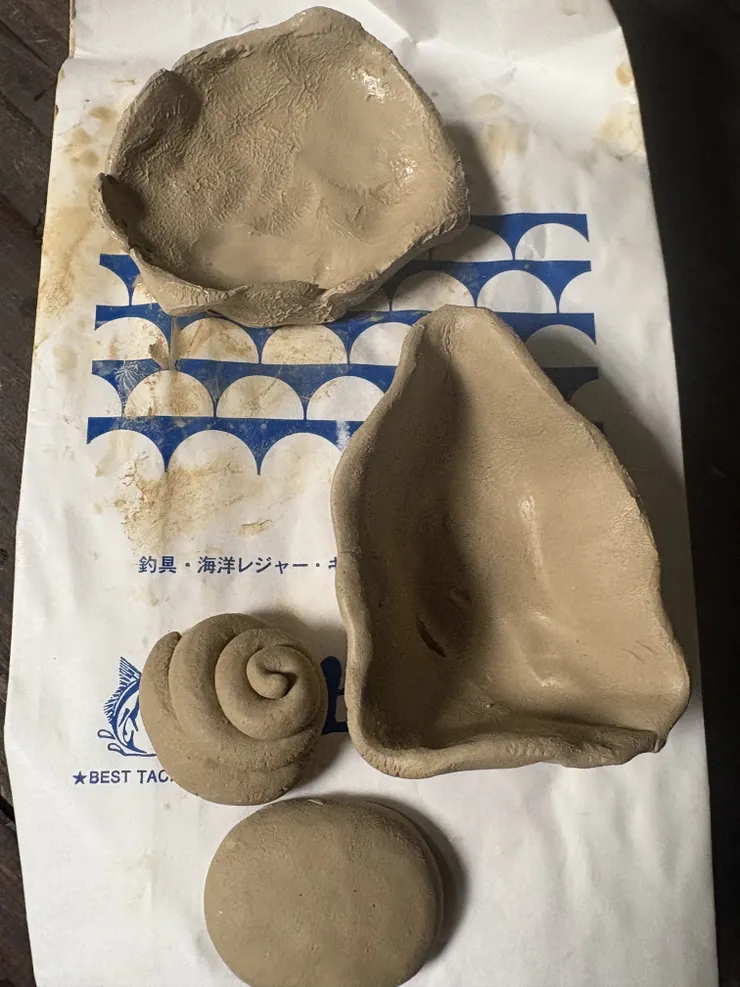 初めてなので手のひらサイズのおちょこを作り、余った分でナッツ類を置ける皿や遊びで置物を造形してみた