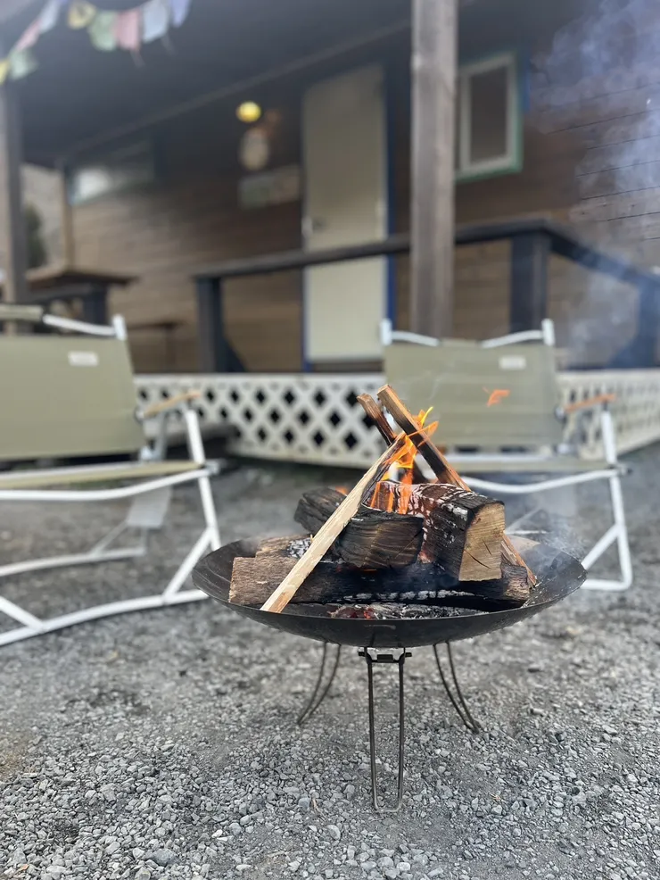 お部屋の前には屋根のあるデッキと砂利のスペースがあり、天候に左右されにくく、外での食事や焚き火の時間を楽しめます。