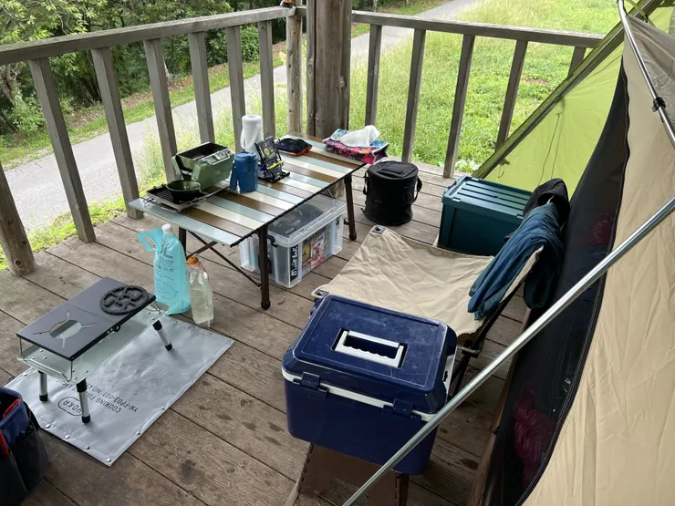 (注!いわゆるデッキサイトではなく東屋なので、デッキペグや柱・手すりを利用して何かを設営したい人は要確認です。私は自立型テントを直接床板に置き、固定せずに使用しました)