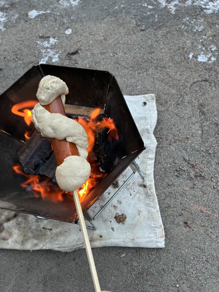 食事はキャンプ場で注文しボリュームあって美味しかったです。朝ごはんのねじねじソーセージ🌭も自分で生地を巻いて焚き火であぶって食べました。パン生地はもちもちして美味しかったです。