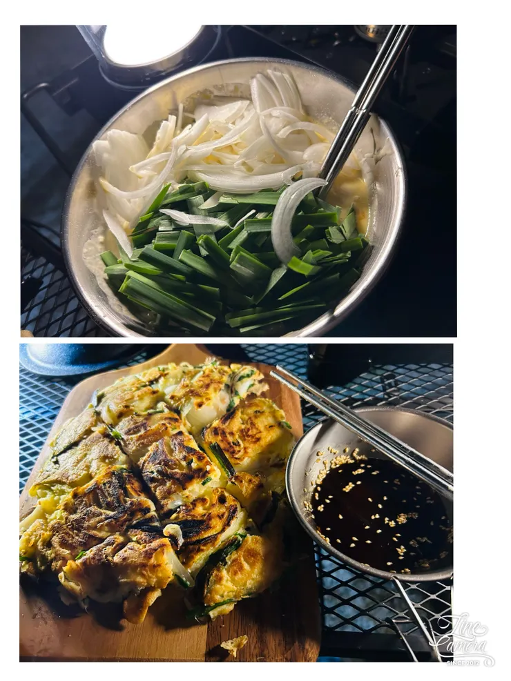 夜は海鮮チヂミ 片手にマルチグリドル、片手にヘラを持って一気に煽って返すのに暗くて遠近感掴め無くて上げる加減が分からなくて流石にプロでも怖かった💦