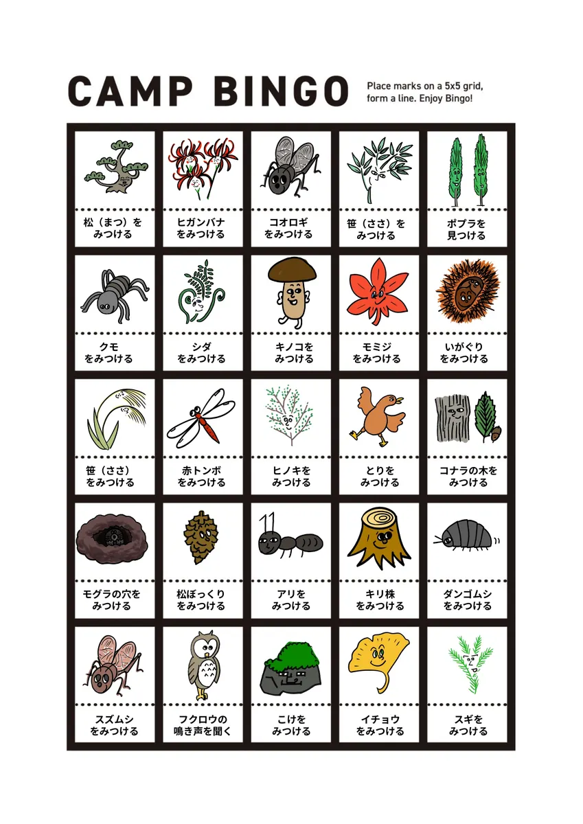 「キャンプ場の森には何がいるのかな?」そんな好奇心を刺激する、自然とふれあう遊びです。 RECAMPしょうなんの豊かな自然を舞台に、動植物や面白い景色を探し出すフィールド探索型・ネイチャービンゴです。