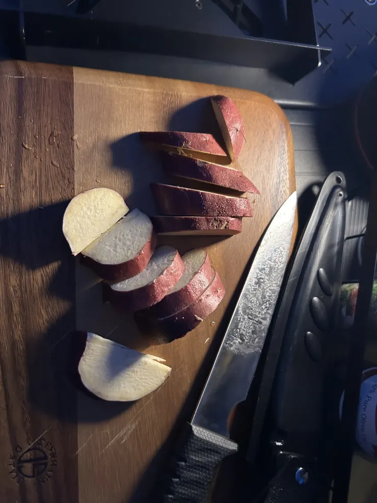 タレは自宅で作って鶏肉に揉み込んでジップロックの袋に入れて持っていきました、前回3月のキャンプの時の夕飯ですが寒波で夜はマイナス気温の時でしたがスキレットで熱々を維持して美味しく食べれました。酒が進むヤツです🍺