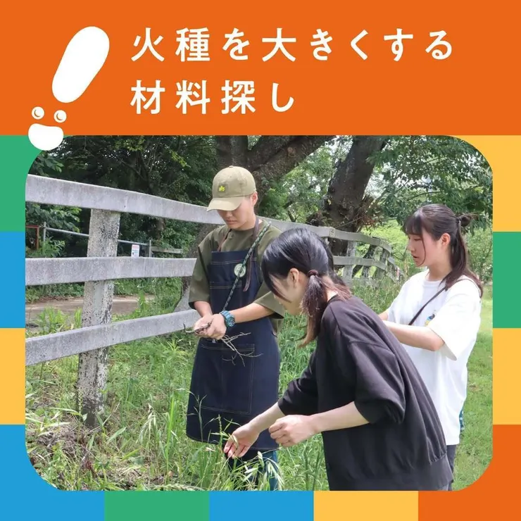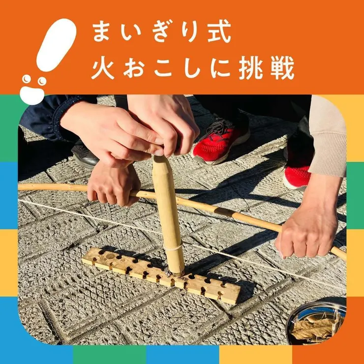ユミギリ式の火おこしで火種をつくり、火を大きくしていきます。