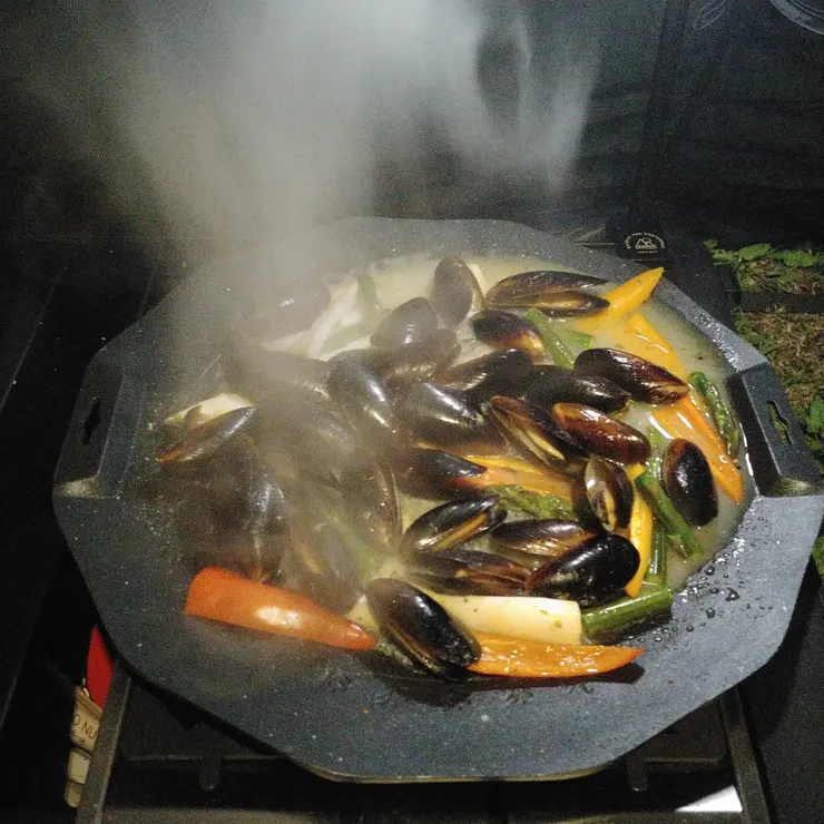 夕飯のムール貝バターガーリック炒め、以前投稿したラビオリを餃子?と言ったキャン友に画像送ったらGを炒めてるみたいだな…だと😤💢