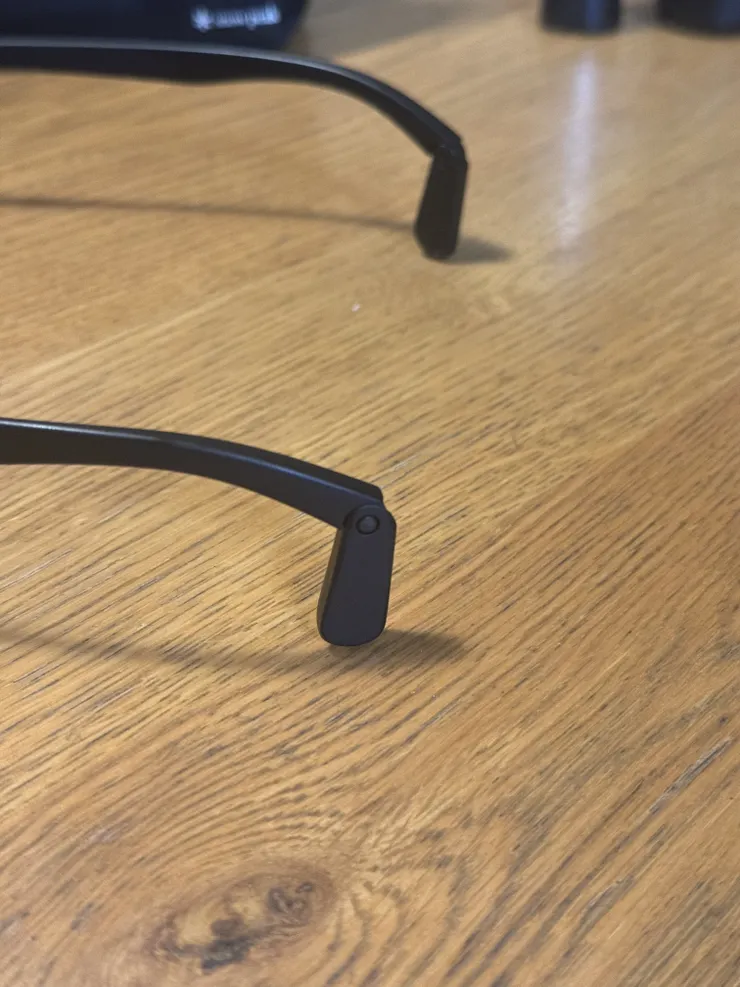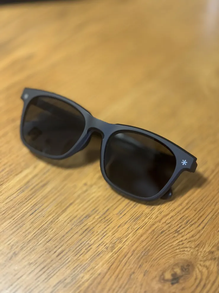 2色のうちのこのマットブラックは柔らかめの素材で装着感が気持ちいい。グラサンは偏光だからドライブ中も使いやすい。アームの先は折れ曲がるようになっていて落ちにくい仕様。案外大事かも。