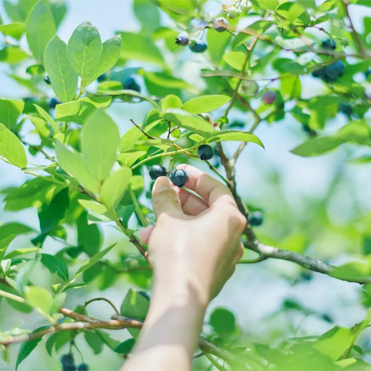 併設農園で恒例のブルーベリー狩りが開催中です。摘み取ってそのまま食べられ、お持ち帰りパックもセットとなっています。