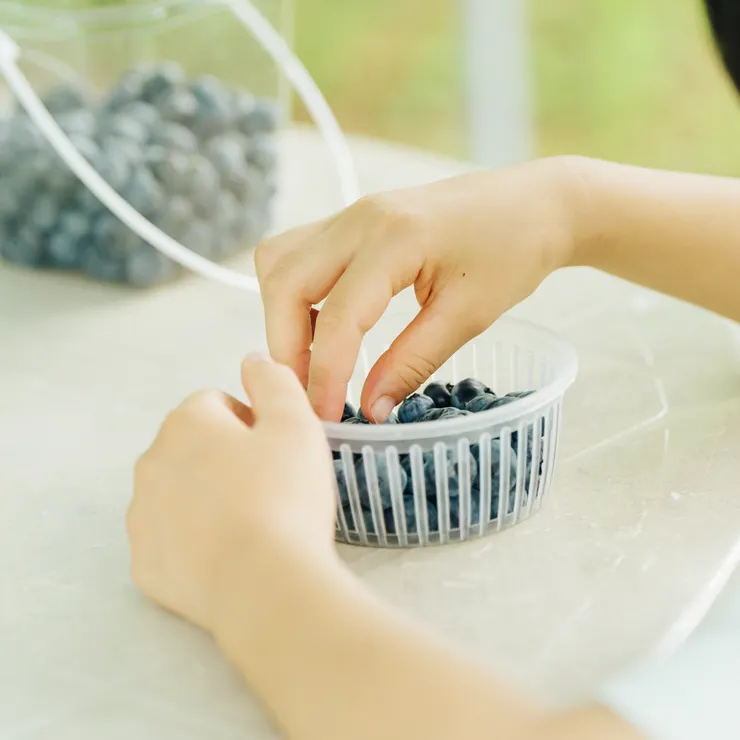 併設農園で恒例のブルーベリー狩りが開催中です。摘み取ってそのまま食べられ、お持ち帰りパックもセットとなっています。