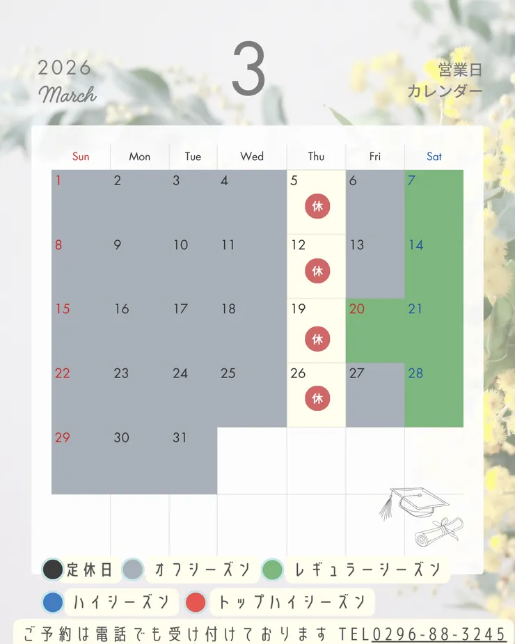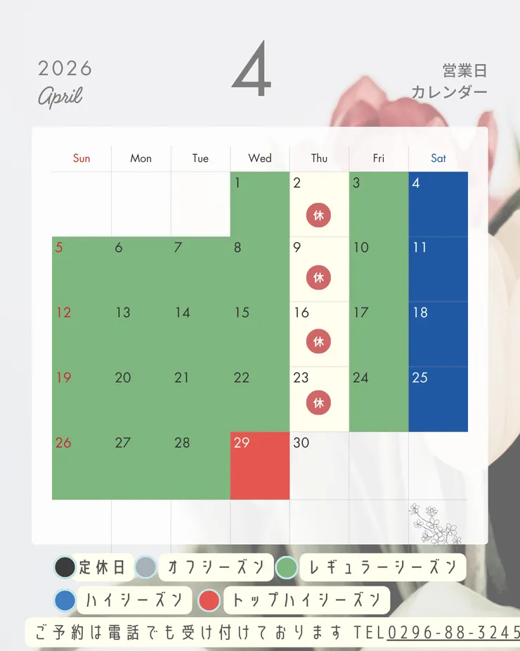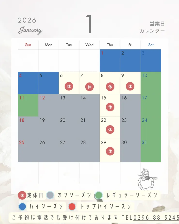 ハイシーズン・トップシーズン・平日割引対象日など、ご予約やご来場の参考にぜひご活用ください。