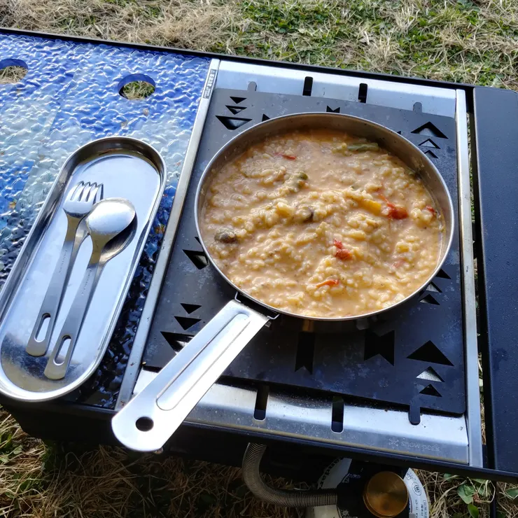 朝ごはんはアクアパッツァ擬きの残り汁にパックご飯をブチ込んで、チェダーチーズ入れてリゾット作りました😄