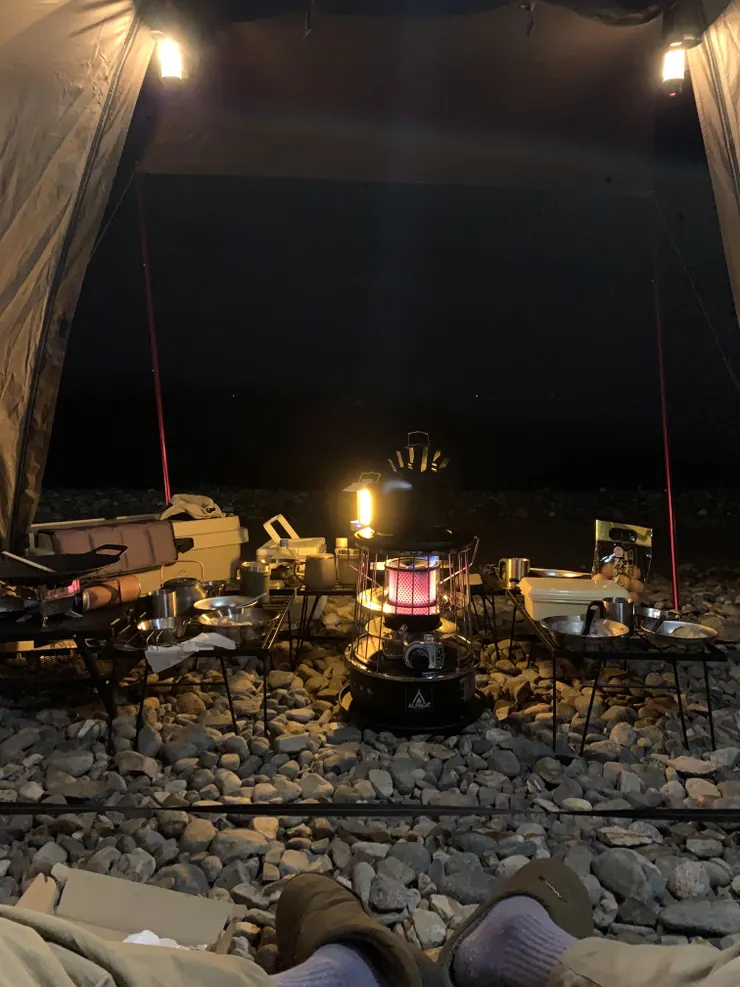 当日は少しだけ、風がありましたが、思ったほど強くもなく、ストーブと焚き火で快適に過ごせました。