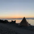日の出前には、海岸線に人が集まりますが、隣のテントの方が、女子2人組に薪ストーブのガイロープに足を引っ掛けられて煙突が根元からポキリと。。😱テントは熱で裂けてしまい、可哀想でしたね。。