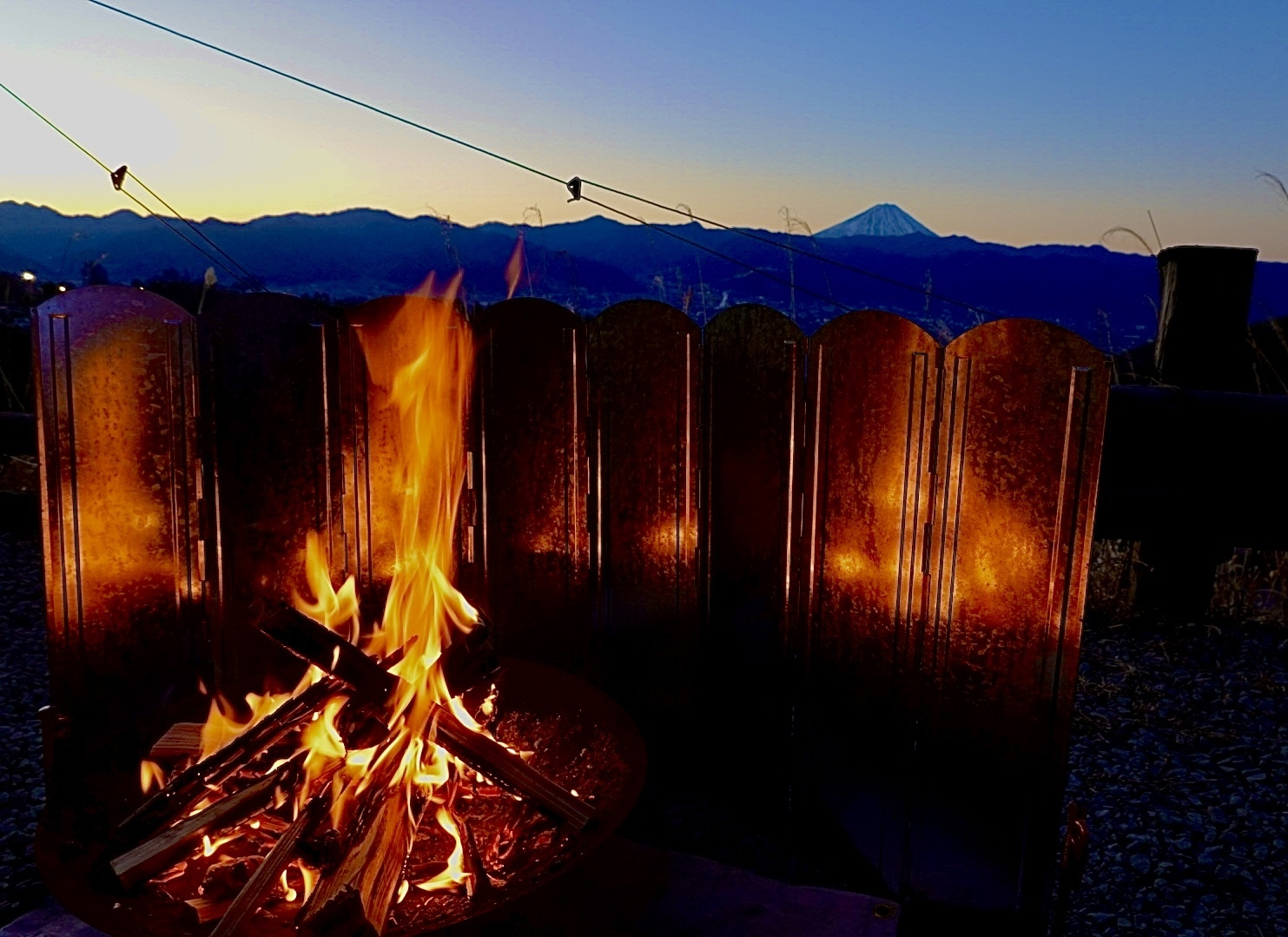 焚き火しながら盆地越しに臨む富士山、最高ですね🔥