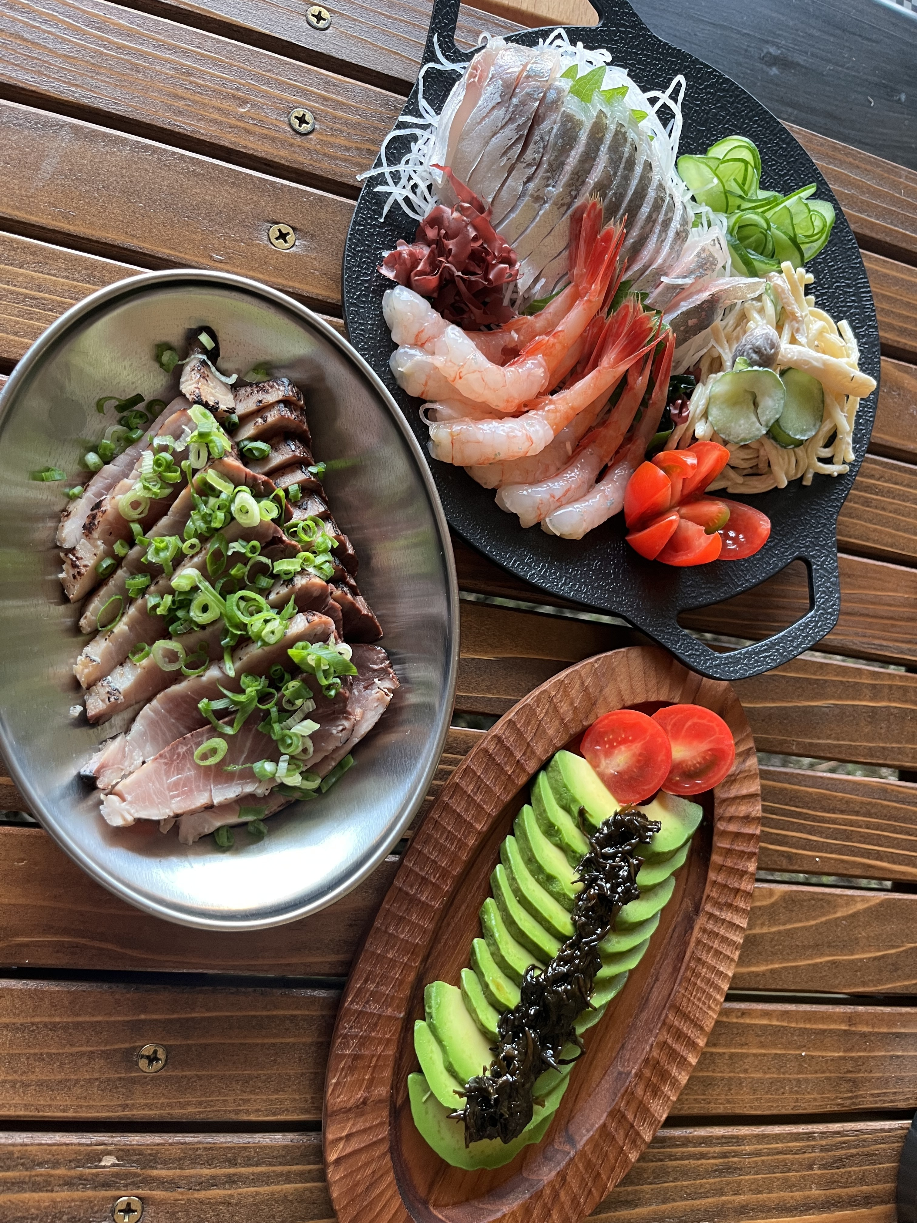 お刺身も炙りも美味しそうだけどアボカドの上に乗っているのは❓海苔の佃煮では無さそう😂❓アボカド好きなんで❤️気になる〜😍