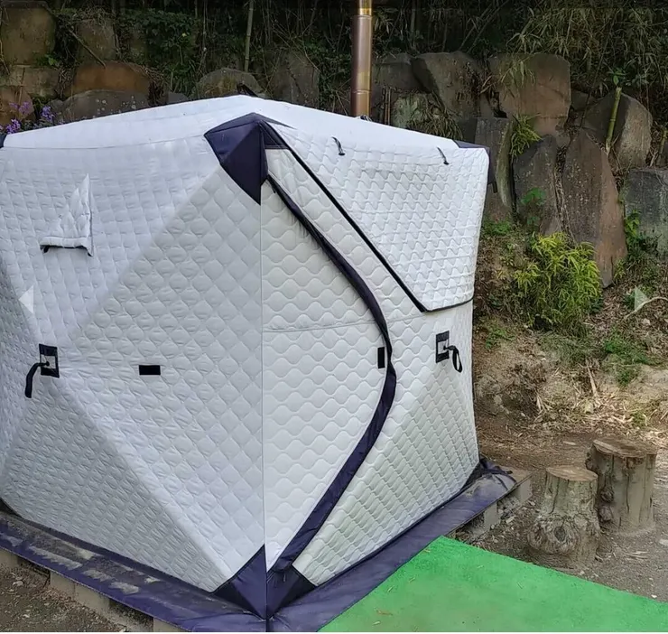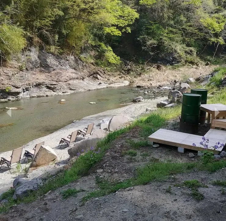 サイト横には浅い川が流れてて、せせらぎも心地よい。テントサウナもあるのでサウナで汗かいたら川へGO。