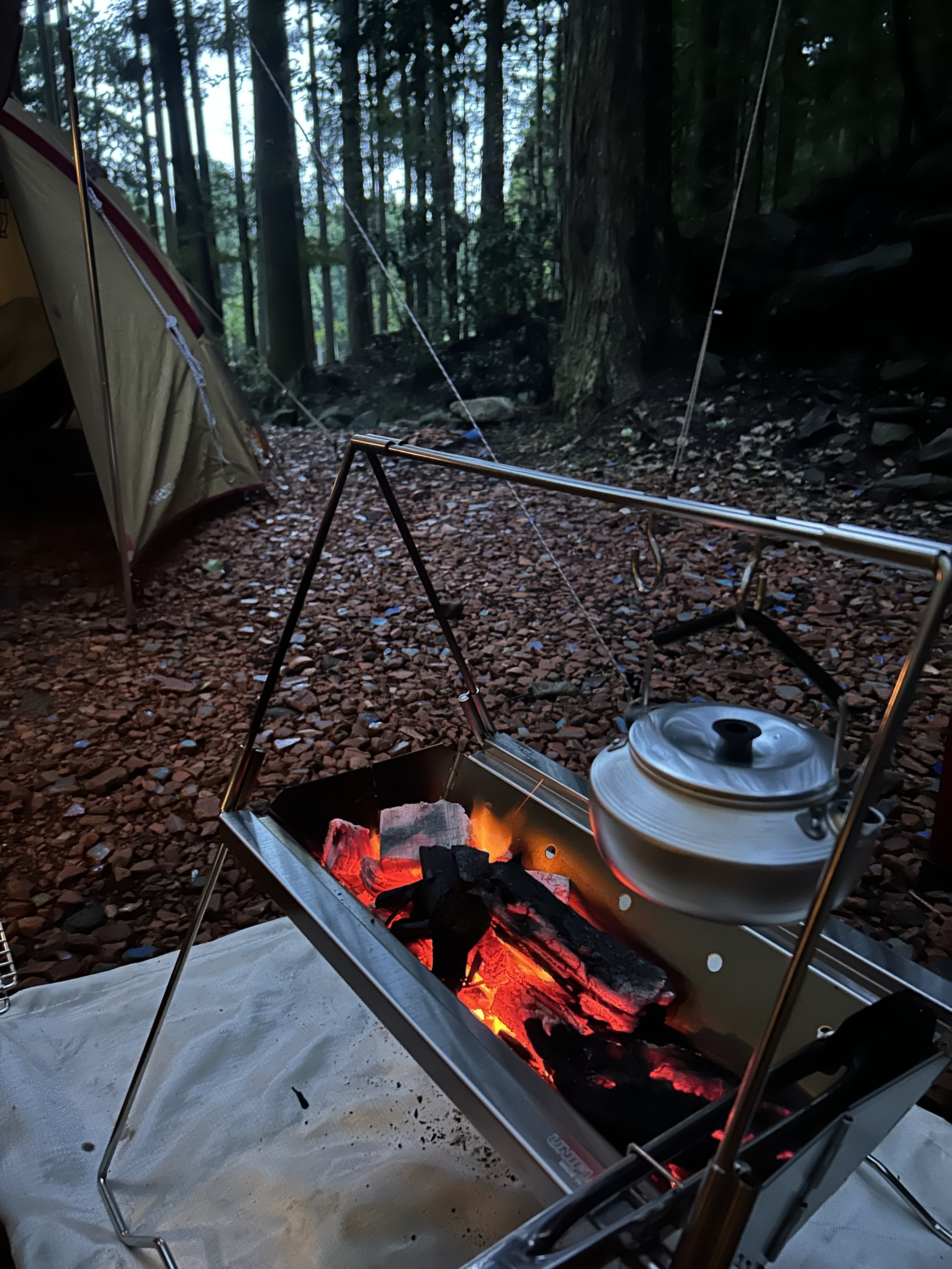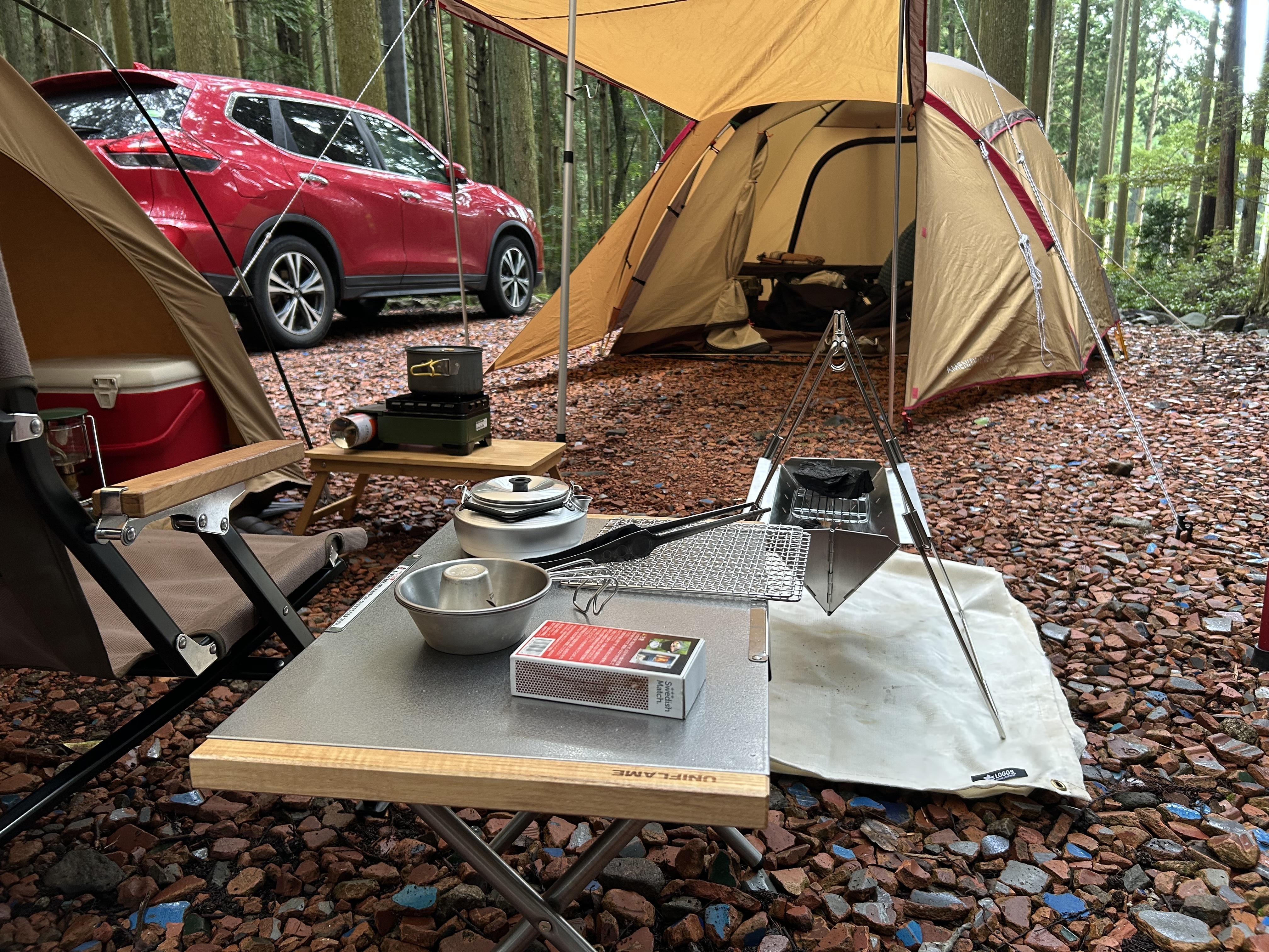 この日は平日で夜から雨予報だった事もあり、他にお客さんが居らず、どこでも好きな場所を使って下さいとの事で林間サイトで雰囲気も良い場所に決めて早速、設営🏕️