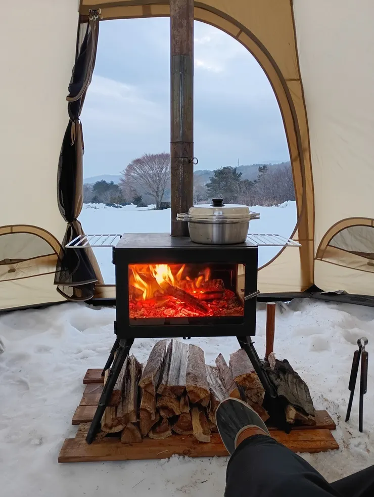 テントの中で薪ストーブの炎を眺める時間は、冬キャンパーにとって最大の贅沢です(3枚目参照)。