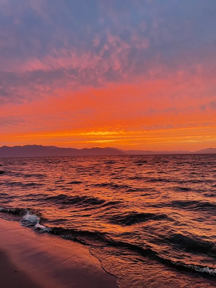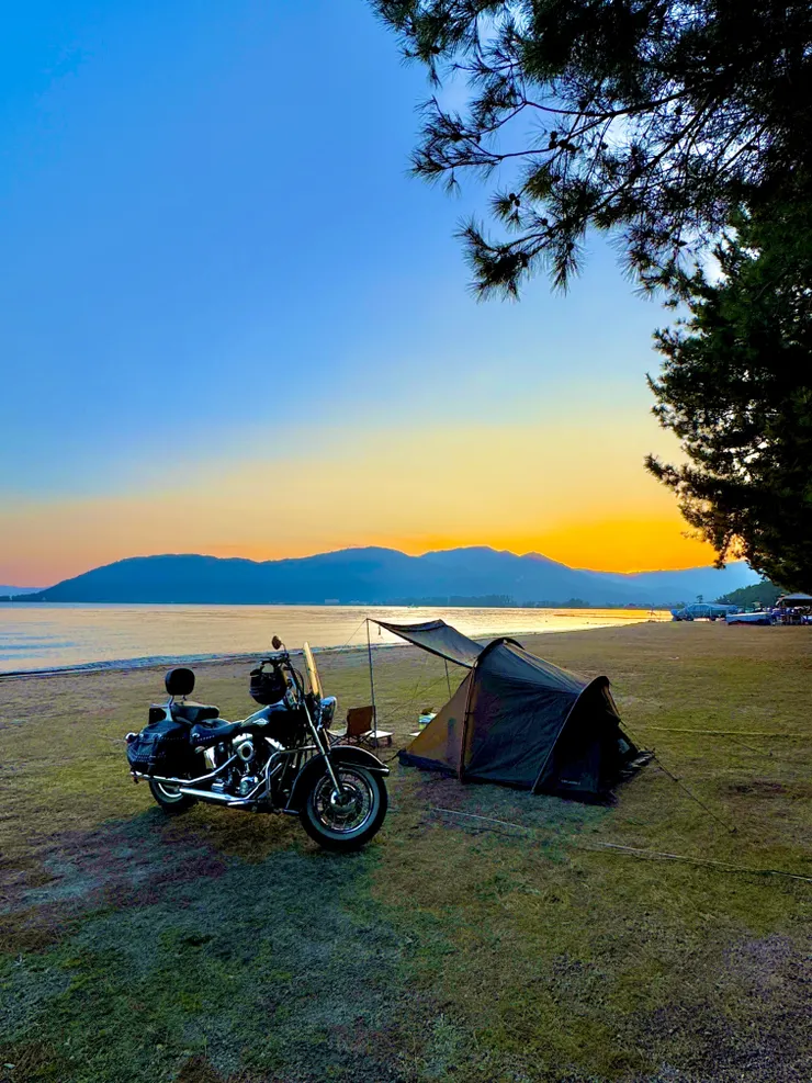 夕方には湖に沈む夕陽が絶景で、夜は波の音を聞きながら焚き火時間🔥