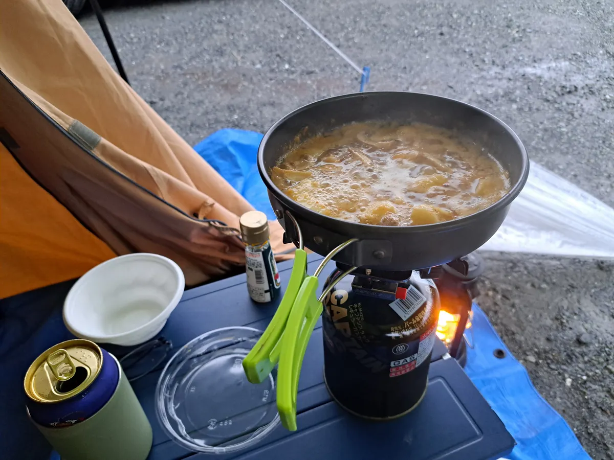 設営を終えた頃また降ってきましたが、あとはタープの下にテントを張るだけ。雨降りであまりテンションが上がらず、アイキャッチ画像の通りテントの張り方が雑になりました💦