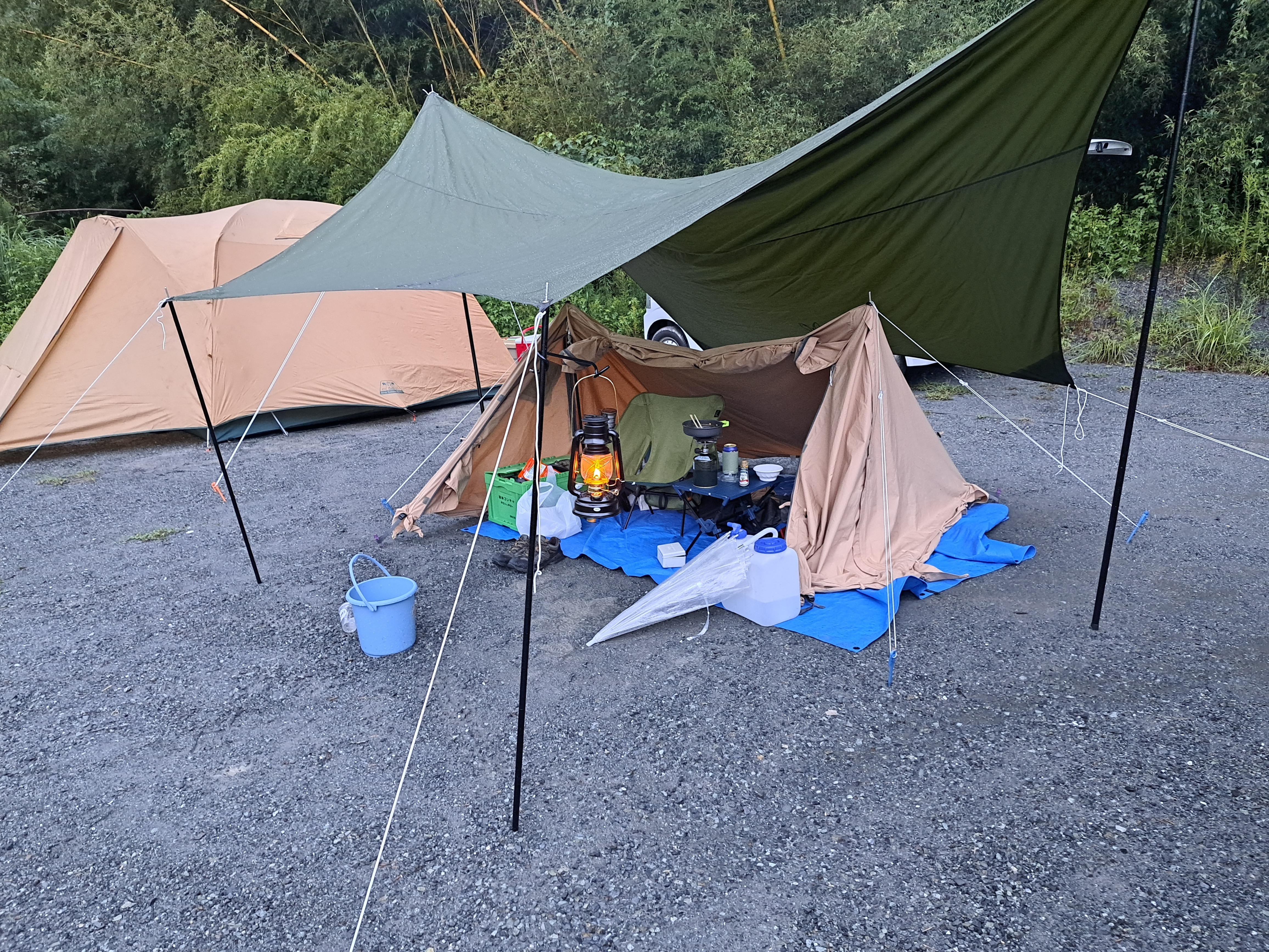 着いた頃はちょうど雨が上がり、しばらく止んでいるようなのでこの時間で急いでタープを設営します。