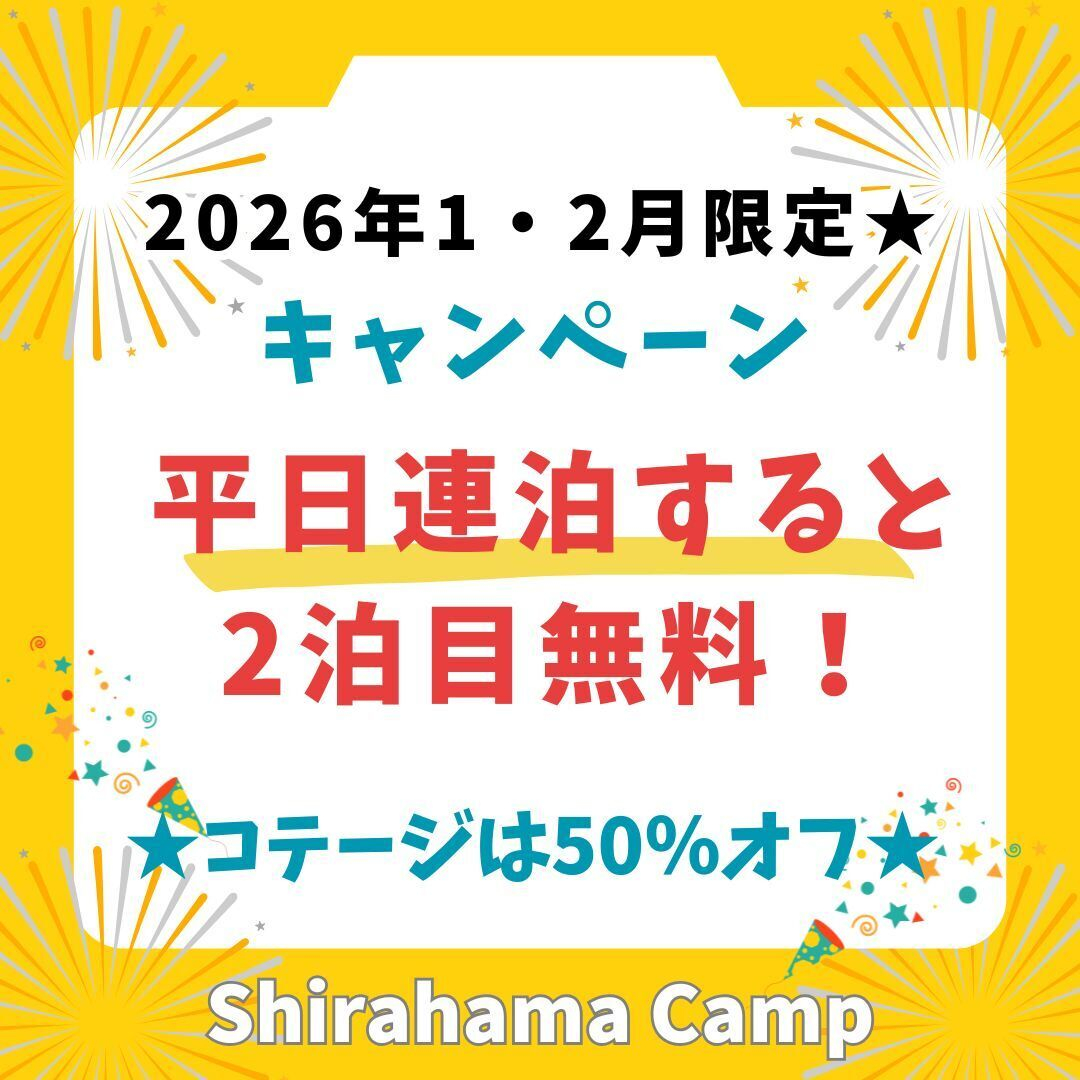 平日2連泊の場合、オート・バイクサイト2泊目無料★コテージは2泊目の宿泊費が半額!