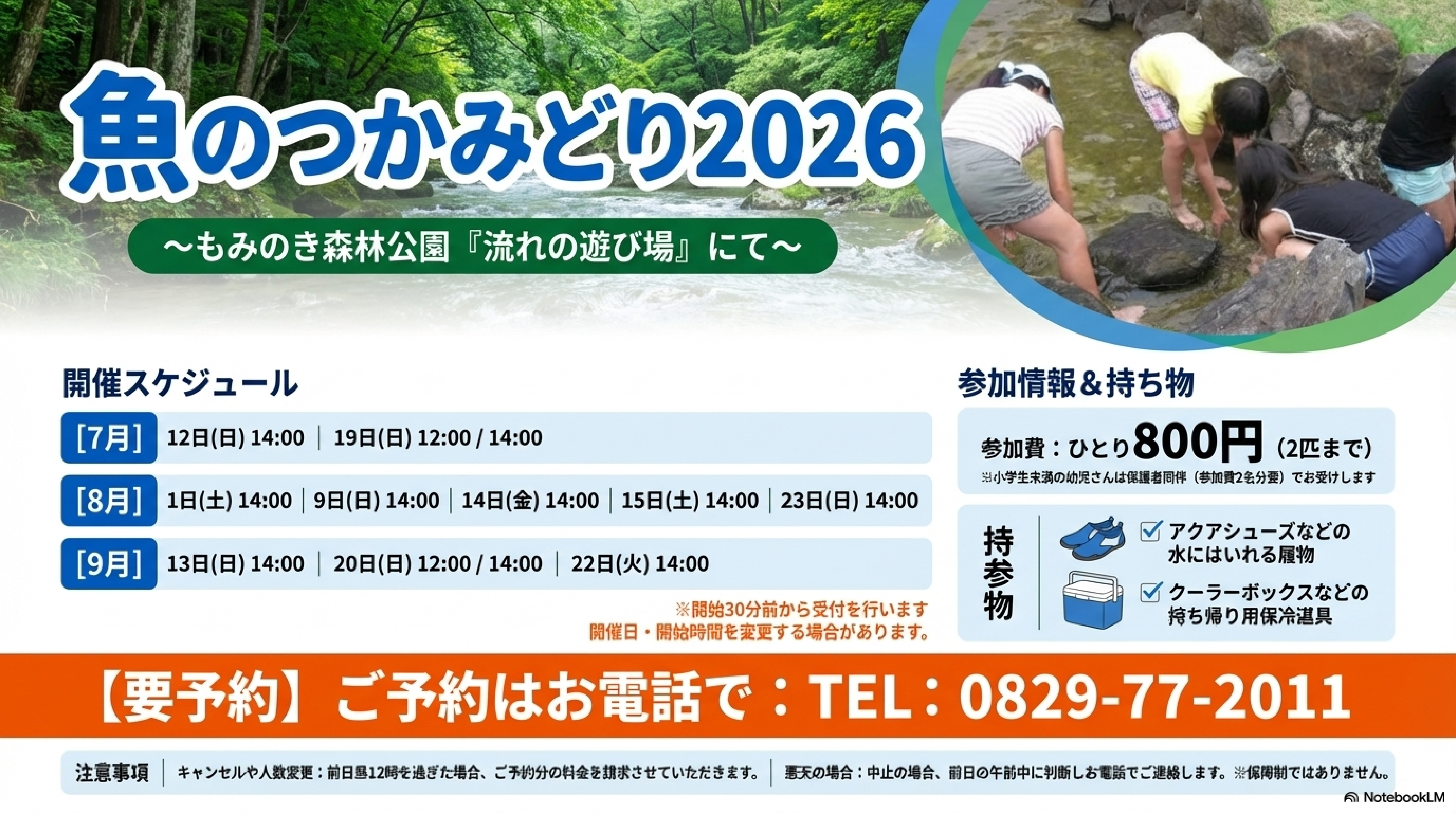 こんにちは!もみのき森林公園キャンプ場です😊ご家族でのアクティビティとして毎年ご好評いただいている「魚のつかみどり2026」を、今年度も開催いたします! お子様やご家族の思い出作りにぴったりのイベントです。ぜひ、チェックしてくださいね!
