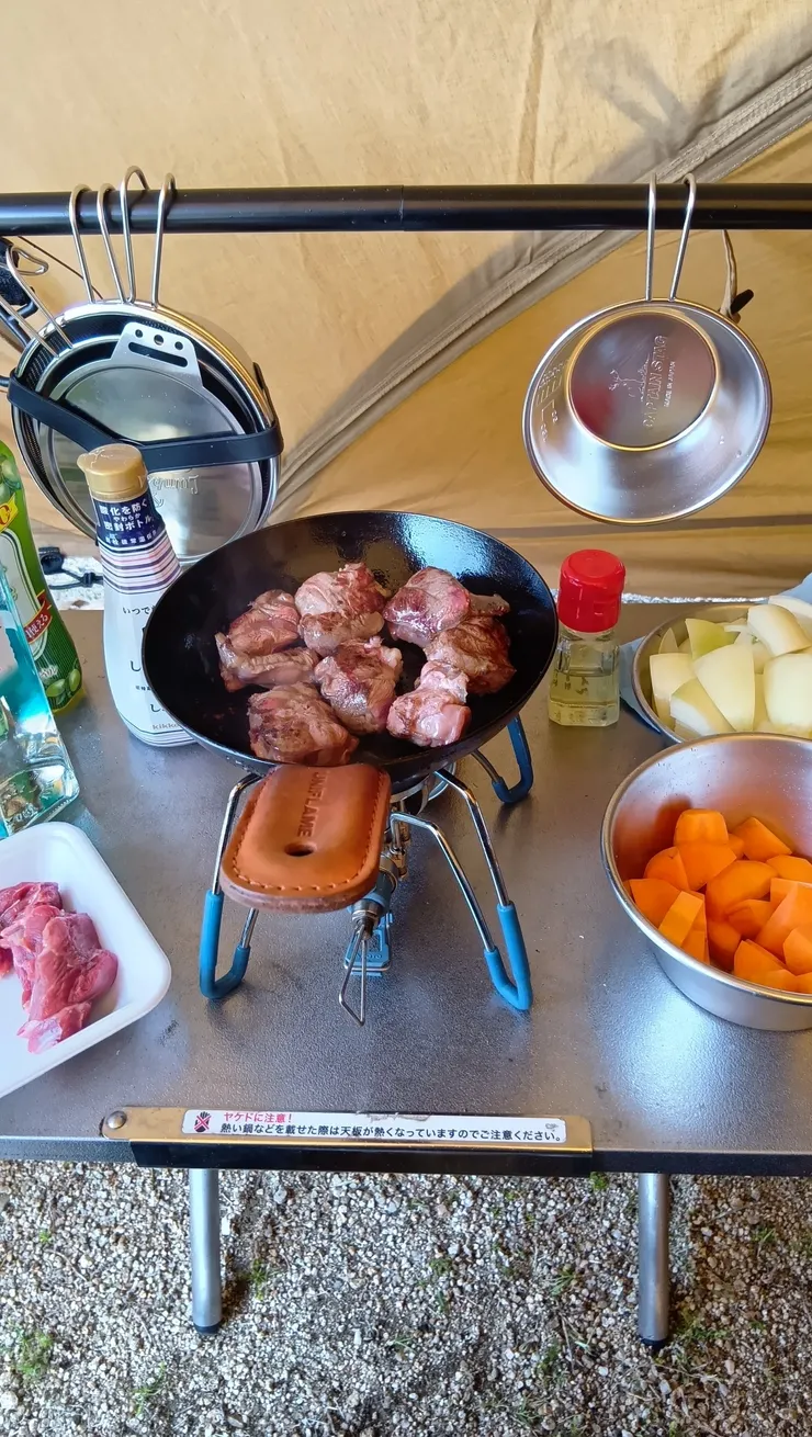 キャンプ2日目の夕食作り、今回は昼間から仕込んでみました。